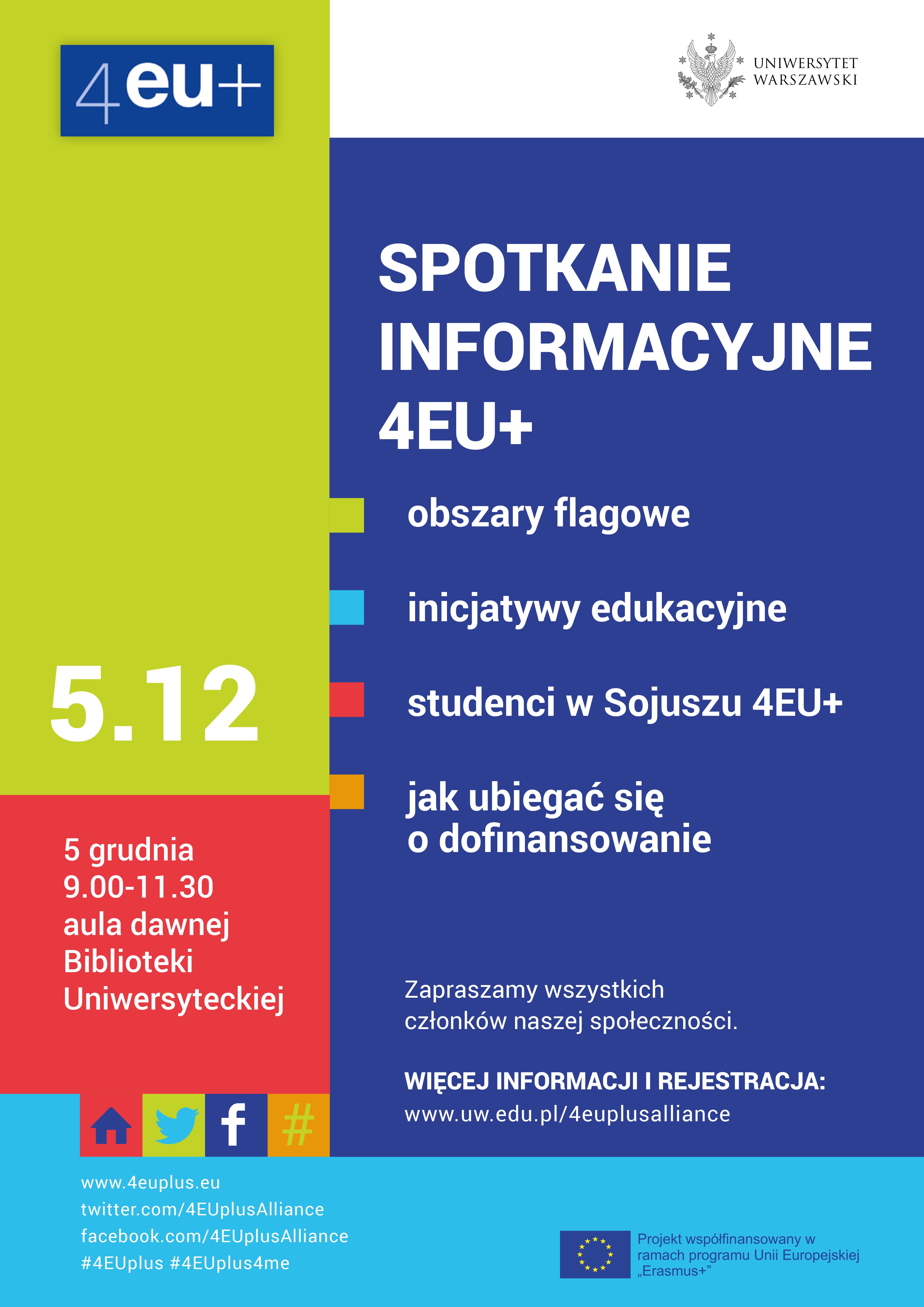 5 grudnia w godzinach od 09.00 do 11.30 w dawnej Bibliotece Uniwersyteckiej odbędzie się spotkanie informacyjne dotyczące działań zaplanowanych dla Uniwersytetu Warszawskiego w ramach Sojuszu 4EU+ oraz projektu „Uniwersytety Europejskie” finansowanego przez program Erasmus+.