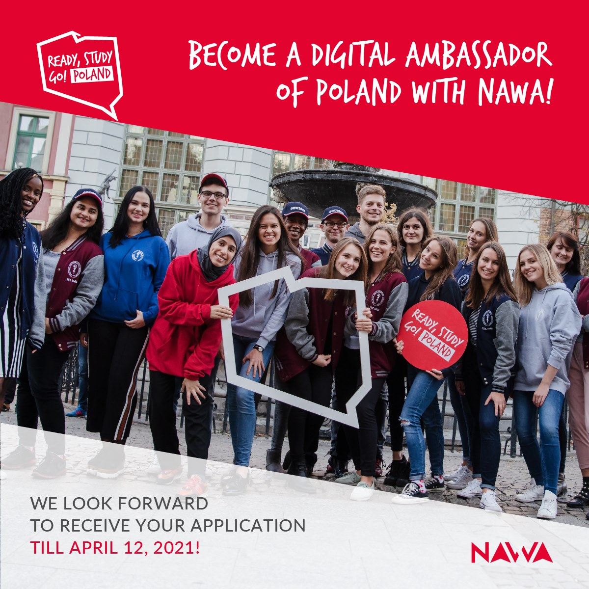 Już tylko do 12 kwietnia trwa konkurs Narodowej Agencji Wymiany Akademickiej na cyfrowego ambasadora Polski! NAWA poszukuje osób, które studiują lub studiowały na polskich uczelniach i które chciałyby podjąć się promocji Polski ukazując własne wyjątkowe doświadczenia w kontaktach z Polakami, polską kulturą i językiem polskim.